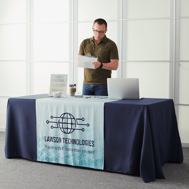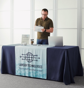 A trade show table covers or runners are a reasonably priced method for prominently displaying your logo and marketing message to visitors.